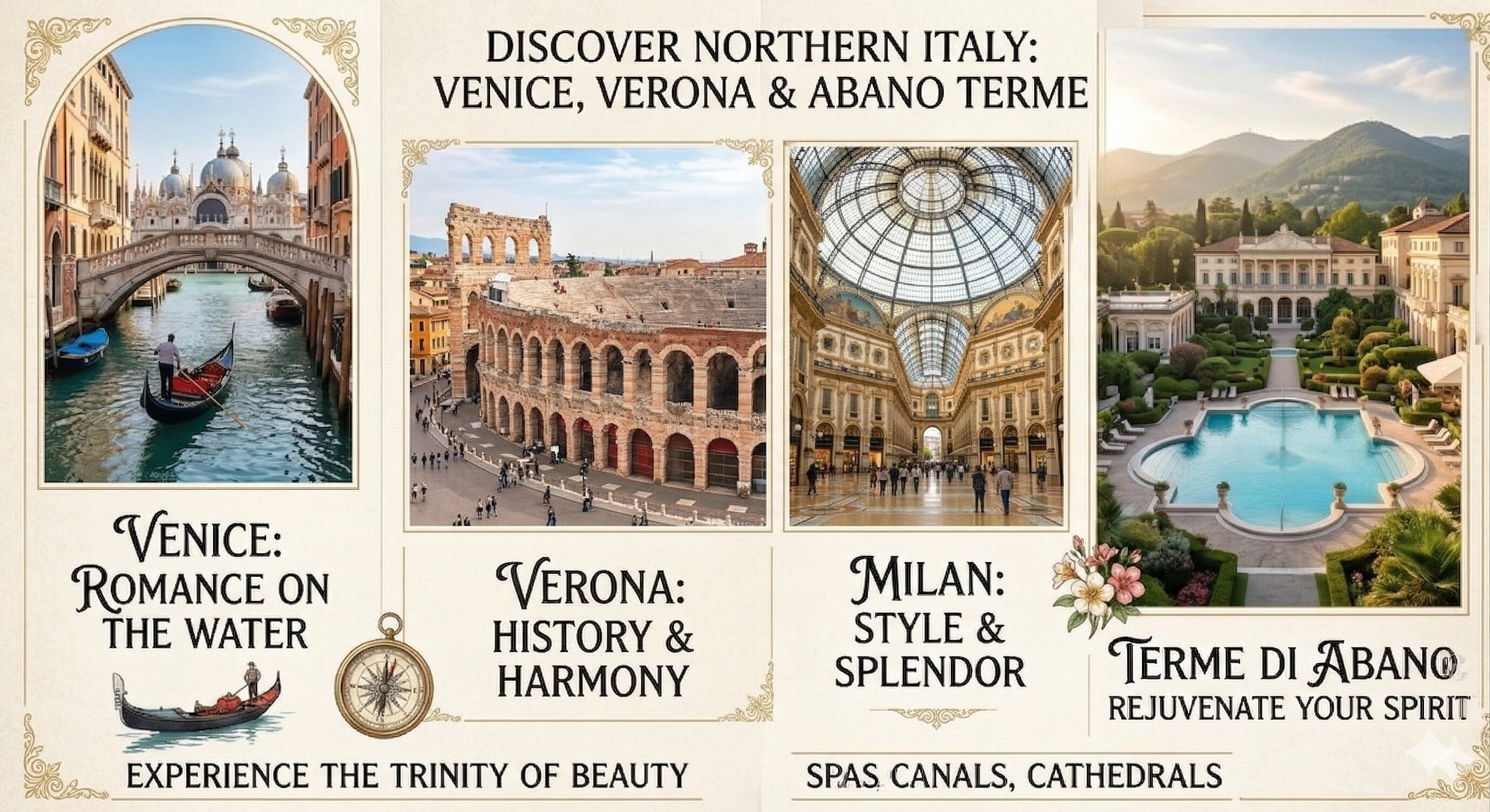 Милан (прилет 1 ночь), Абано Терме (6 ночей), Венеция, Верона, Падуя, Бергамо, Сирмионе, озеро Гарда, Мальчезине, Монте Бальдо, Лацизе, Милан (1 ночь, вылет)
